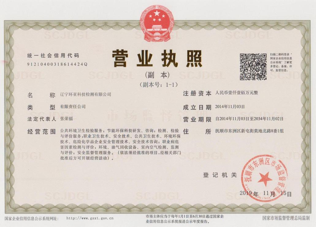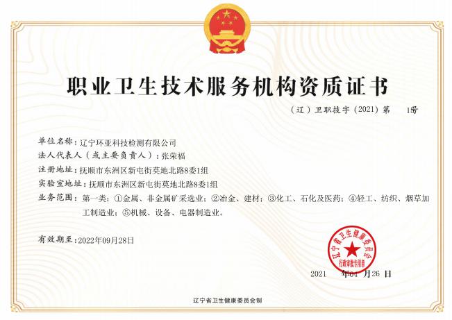 遼寧環(huán)亞科技檢測有限公司秉承“公平、公正、客觀、真實”的服務理念,力求為遼寧省各企事業(yè)等用人單位提供更優(yōu)質(zhì)的服務,公司領導率領全體員工歷時一年零八個月的時間操練各項基本技能,于2016年8月9日取得了(遼)安職技字(2016)第B-0019號《職業(yè)衛(wèi)生技術服務機構資質(zhì)證書》